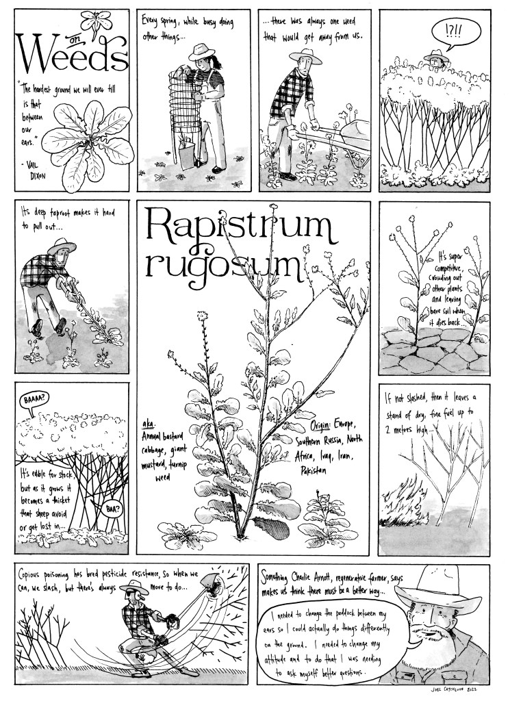 In the first couple of years we saw an explosion of weeds. It reminds me of when Allan Savory describes the landscape as a coiled spring. Conventional land management, which tries to simplify a landscape into a few easily managed variables, regularly compresses the spring and increases instability and fluctuation through the removal of species. When the management changes, as it did with us, the spring unfurls, sometimes bouncing uncontrollably as the energy of the previously suppressed processes are released. For us, we saw entire paddocks overrun with wild mustard, almost head high. We mowed a bit and tried to work out what the mustard was telling us.