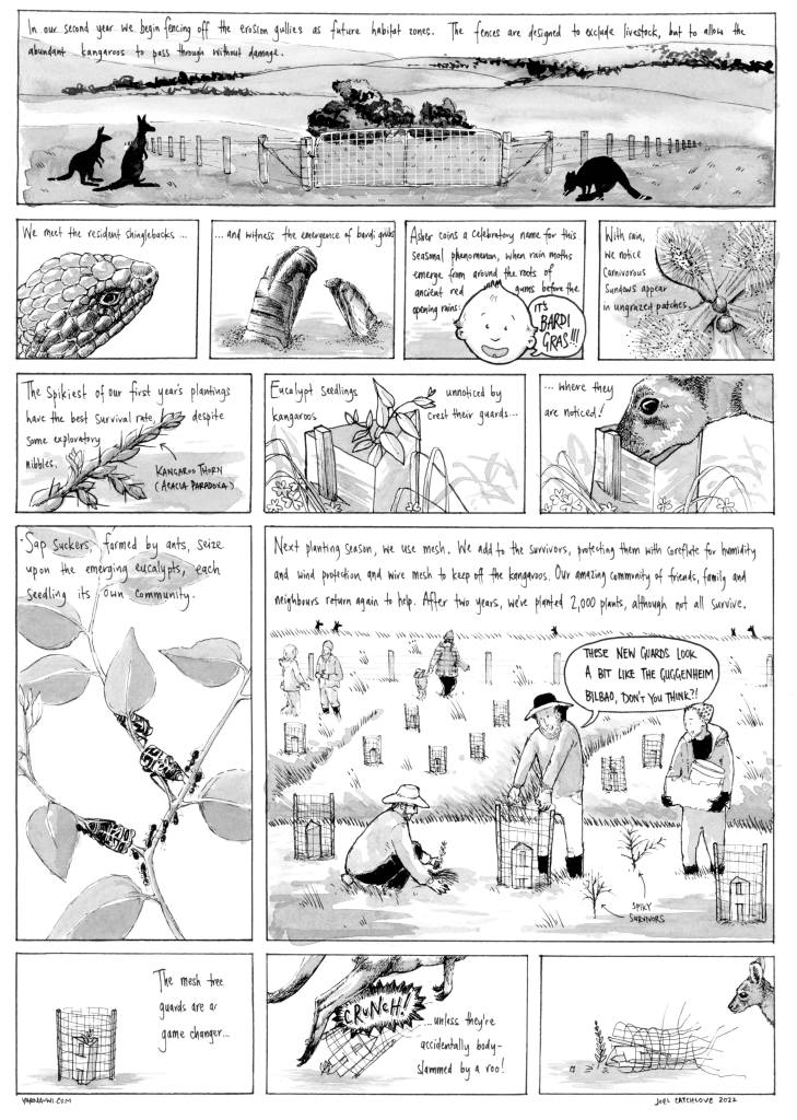 We tried new approaches with the kangaroos, some practical and some philosophical. Sophie refined tree guard designs while I attempted to speak to them and explain the project and our intentions to recreate habitat. Eventually, with kangaroo impact so intense that it was creating erosion channels, we resorted to a small cull and the trees had an opportunity to take hold. They were largely invisible, waiting in their guards for five years, but eventually gathered their own momentum. The pace of the ecosystem.