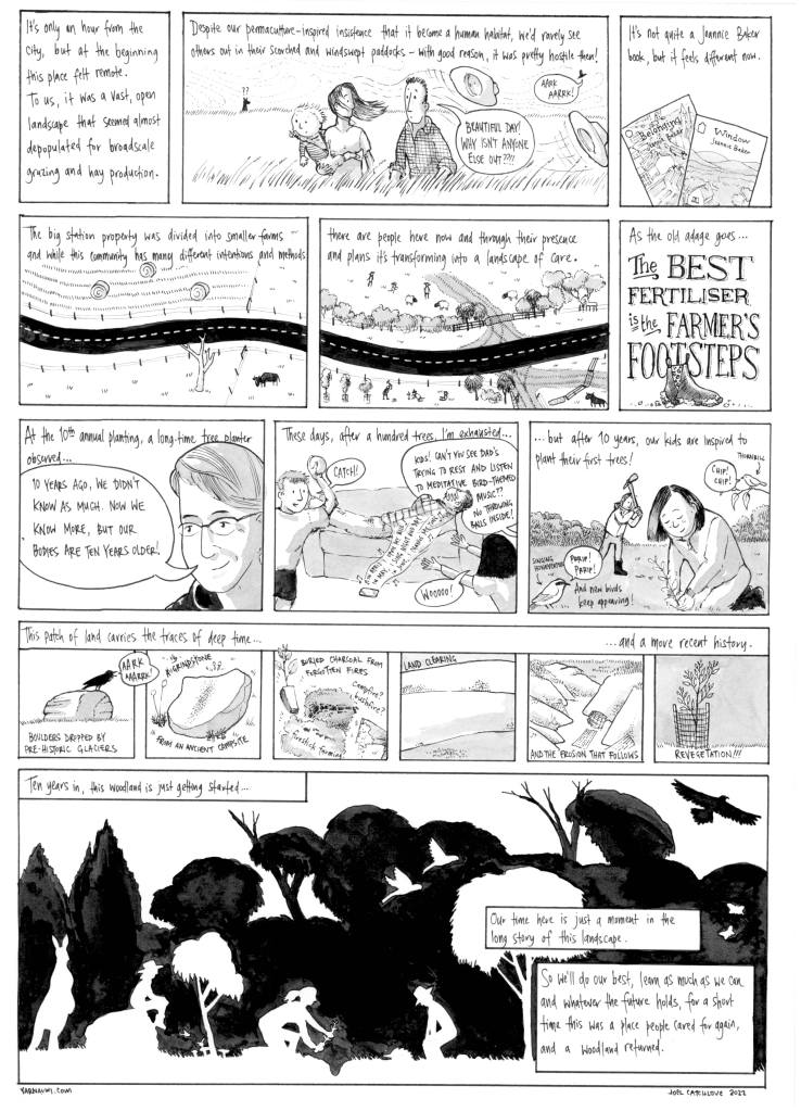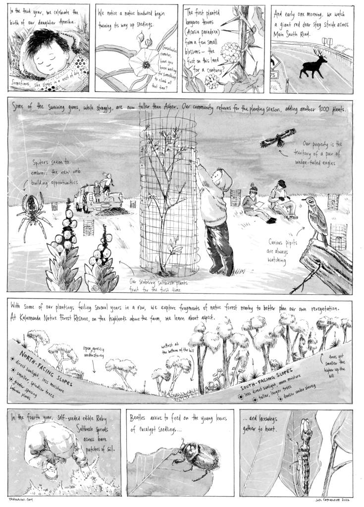 So we signed the papers, after which the lending advisor gleefully told us, “You realise that “mortgage” means “dead pledge”, it’s a debt you have until you die! Ha ha!” If that wasn’t terrifying enough, we quickly realised we were way out of our depth. We were suddenly chillingly aware that we were now perched precariously in the middle of countless visible and invisible natural processes that we had neither the knowledge nor the capacity to manage. Visiting on the weekends with a young child, a wheelbarrow and a few hand tools, the place felt like it was spinning out of our control. Plants grew, rain fell, erosion gullies marched uphill, sinkholes formed, kangaroos grazed in their hundreds.