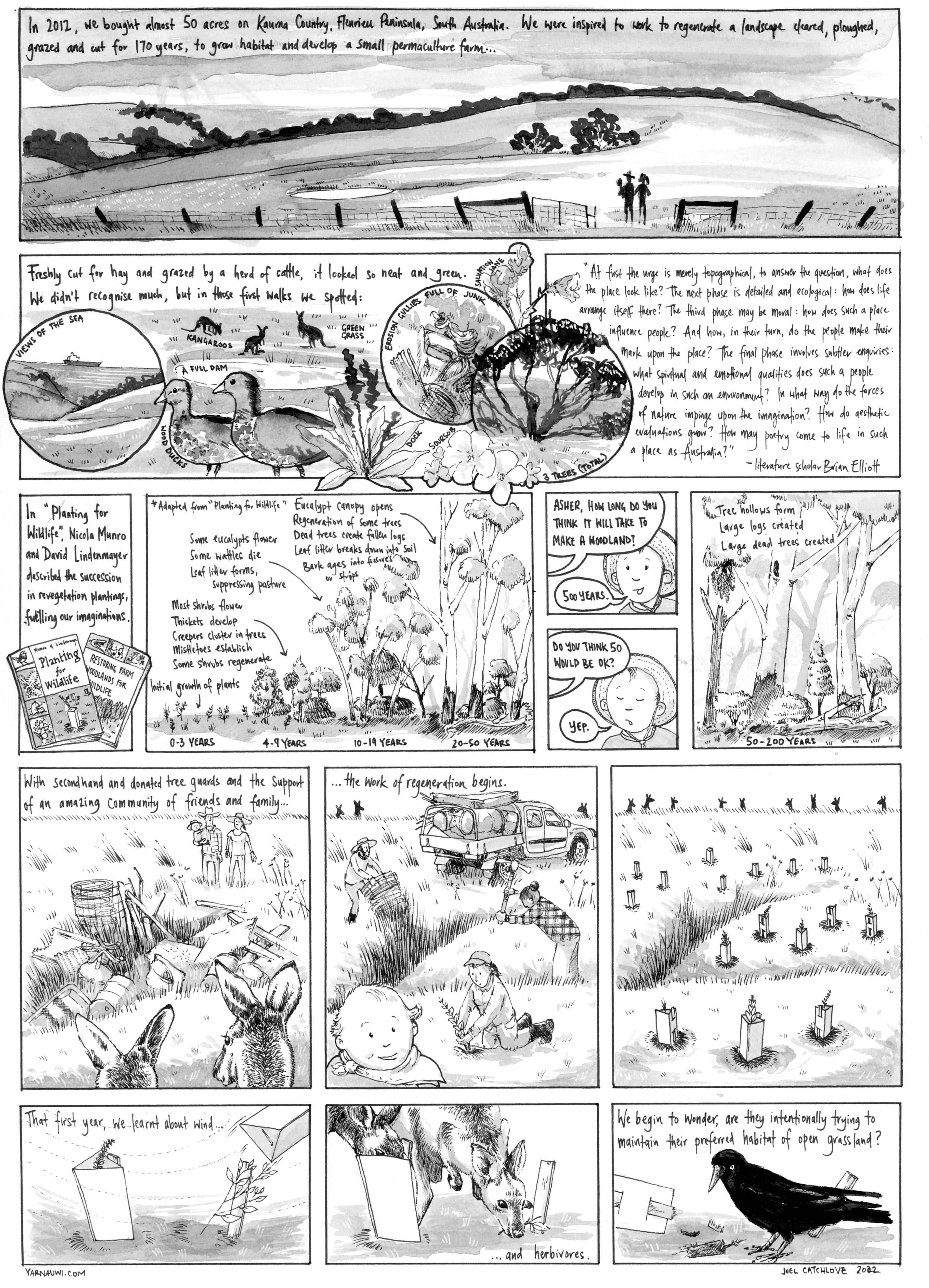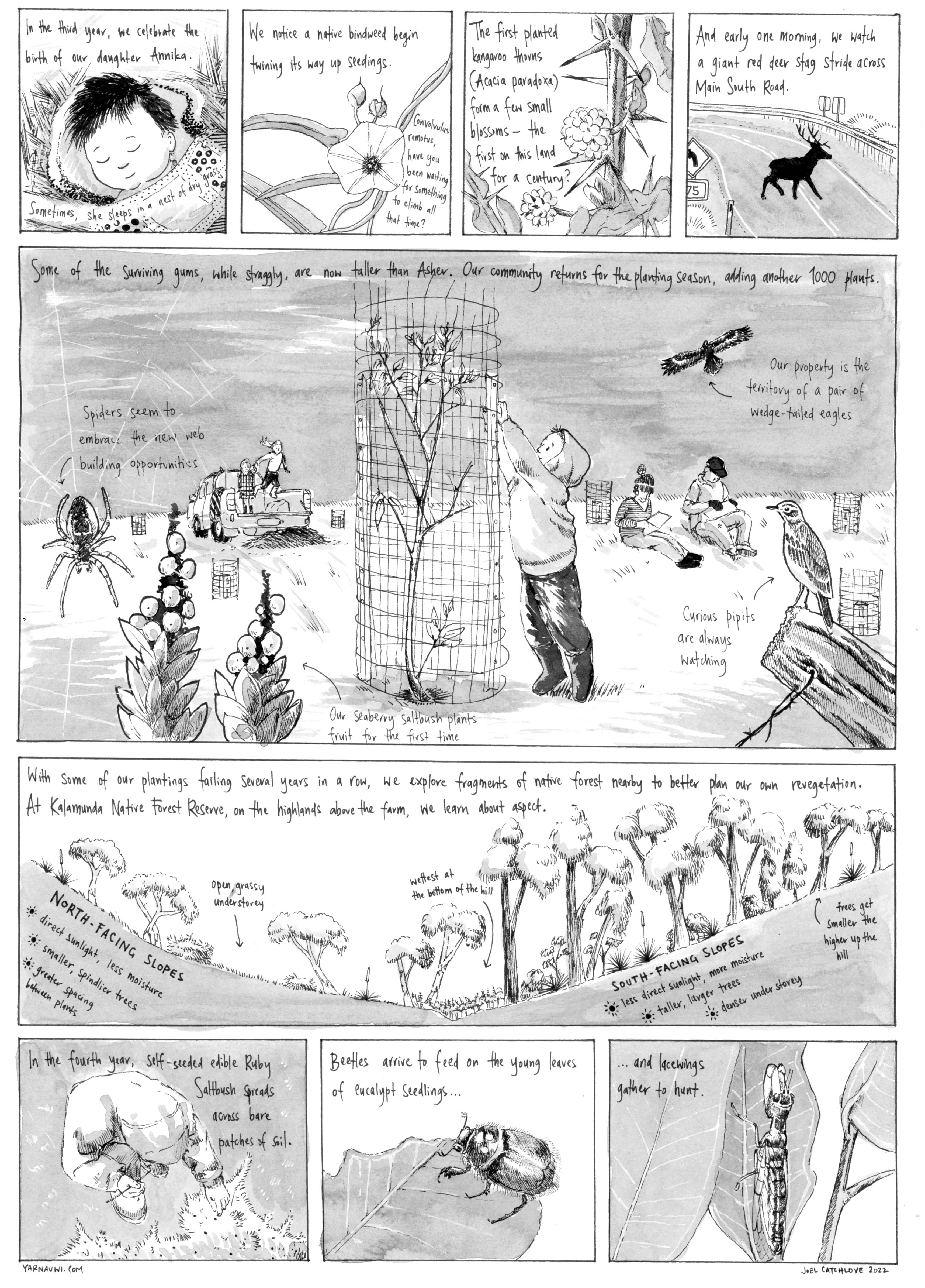 So we signed the papers, after which the lending advisor gleefully told us, “You realise that “mortgage” means “dead pledge”, it’s a debt you have until you die! Ha ha!” If that wasn’t terrifying enough, we quickly realised we were way out of our depth. We were suddenly chillingly aware that we were now perched precariously in the middle of countless visible and invisible natural processes that we had neither the knowledge nor the capacity to manage. Visiting on the weekends with a young child, a wheelbarrow and a few hand tools, the place felt like it was spinning out of our control. Plants grew, rain fell, erosion gullies marched uphill, sinkholes formed, kangaroos grazed in their hundreds.