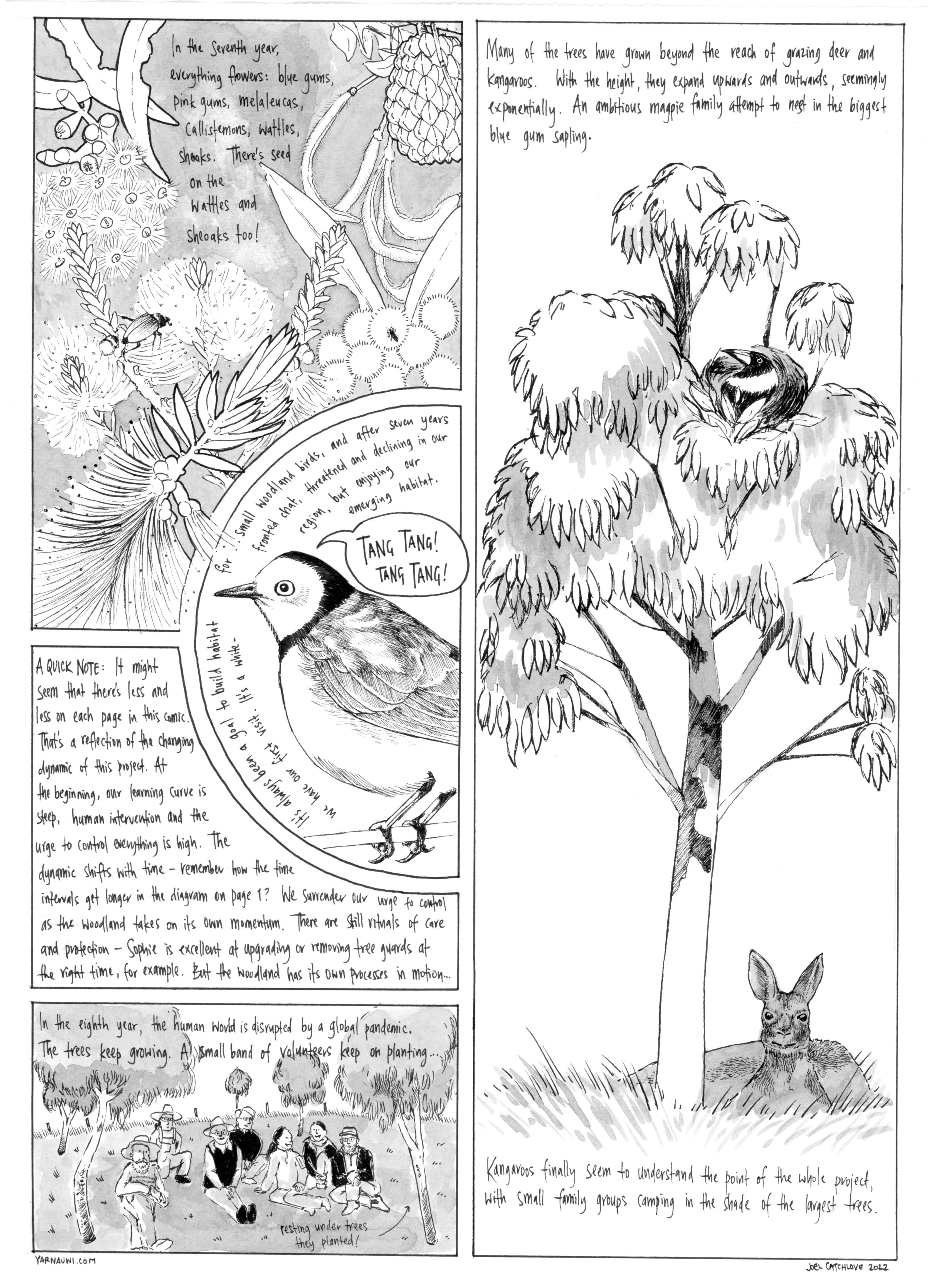 We tried new approaches with the kangaroos, some practical and some philosophical. Sophie refined tree guard designs while I attempted to speak to them and explain the project and our intentions to recreate habitat. Eventually, with kangaroo impact so intense that it was creating erosion channels, we resorted to a small cull and the trees had an opportunity to take hold. They were largely invisible, waiting in their guards for five years, but eventually gathered their own momentum. The pace of the ecosystem.