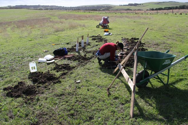 Sophie gets stuck into some more planting around a tunnelling site after contours have been measured with home-made A-frame. Tree guards here are recycled vine guards, fixed together in pairs to make larger, hexagonal guards.