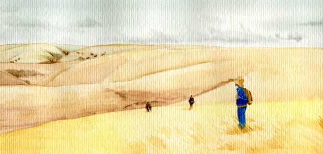 This is based on a photograph our friend Jess took of an attempt to walk to Second Valley from the block. I was taken with the mood of Jess’s photo, with the dark figures of the hikers against the sepia of the landscape and a brooding sky. Didn’t quite capture that. Ah well. Pretty pleased with my ‘wet-on-wet’ sky though!
