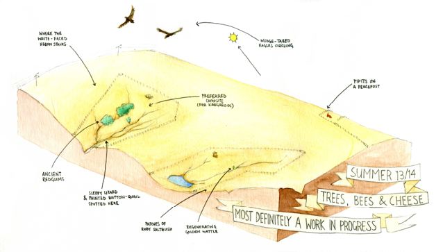 This ‘block diagram’ of the property was inspired by the work of nature educator John Muir Laws (http://www.johnmuirlaws.com/). It’s a great process to visualise the observed contours of a place and to populate it with other natural phenomena. Maybe this will become an annual tradition and another way of celebrating change on the property.