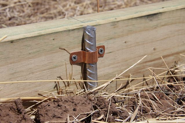 Tank-pad bling: The rebar and plumber’s clip fixing option. It’s a good idea to knock the rebar to just below the surface of the timber to avoid it piercing the tank when it’s unloaded.