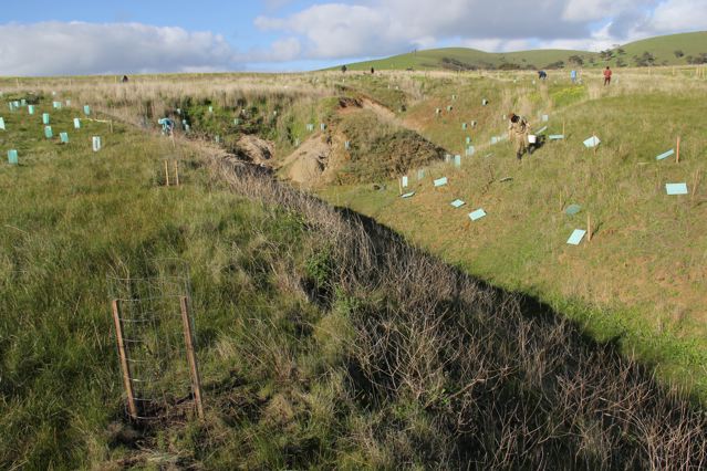 While the vegetation cover of the erosion gullies is improving since stock have been excluded, we’ve also observed that they have their own extreme microclimates. In winter they’re bare and swampy, in summer they’re bare and arid, with noticeably higher temperatures that the surrounding land. A focus has been to also work to grow canopy to allow shading of the gullies and greater potential for more complex vegetation to establish.