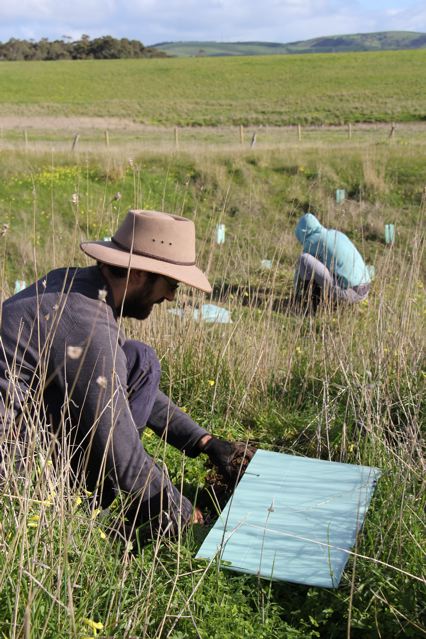 While we’ve written elsewhere about the structure of woodland, we’ve gone for a high planting density based on previous experiences with enthusiastic grazing by kangaroos and deer. We’ve also amped up protection for particularly high value trees, selected according to species, shelter, habitat or erosion control value with the use of both homemade and purchased wire mesh guards. Throughout the planting, while the resident mob of kangaroos perched on a nearby hill and noted the GPS coordinates of every tree as it went into the ground, we’re pleased to say that they’ve so far been quite restrained in their sampling! Perhaps the sudden appearance of all those green tree guards has spooked them a little. We’ll see.
