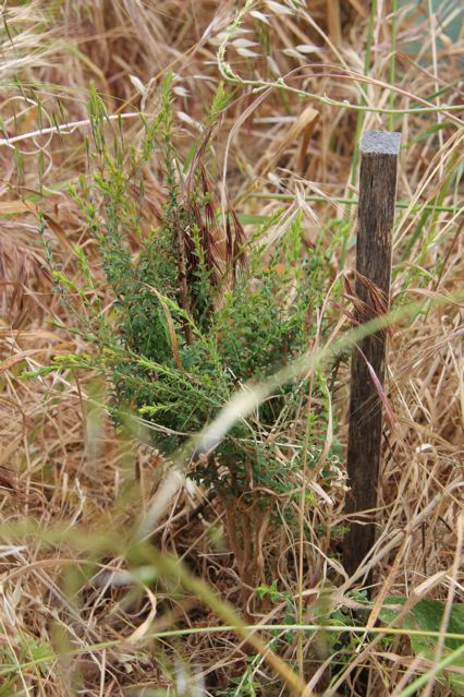 Melaleuca lanceolata, one and a half years since planting, two years since germination. Repeatedly grazed by roos, but now with thick, woody stems.