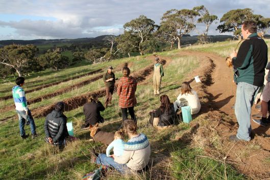 We were too busy to take any photos of our farm tour with the Permaculture Association of SA, but here we are at another permaculture-based property near Cape Jervis as part of the same event. Here Chris Day and Pedro Rowley talk about their design for water-harvesting swales for a future orchard on the steep, pink gum woodland site.