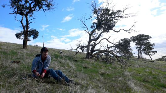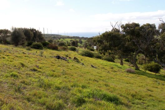 Impatient as we are, we’ve become slightly obsessive about “before-and-after” photos in an effort to stay inspired about the possibilities for landscape transformation. About 15 minutes down the road from Yarnauwi, our friends David and Gillian have been gradually revegetating a former grazing property in the hills above Cape Jervis. Perhaps because of its steepness, the property has retained a good number of big old pink gums, together with the occasional ancient sheoak, offering the beginnings of a canopy for regeneration. Seven years ago we helped out with one of their first planting weekends, and I recently unearthed some photos taken at that time. With David, we recently walked around the property to admire the last seven years of growth.