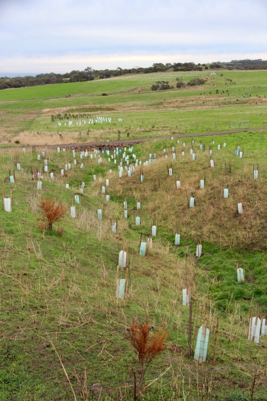 New tree guards mark some of 2019’s plantings, from front to back: gully stabilisation and revegetation, woodlot expansion and, at very back, silvopasture planted on contour.