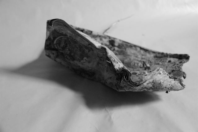 Polystyrene remains one of the most contentious plastics due to its exceptionally long lived nature and its ubiquity making it a significant environmental hazard, particularly in aquatic environments. So here it is. The 6 sausages or 2 chops it hosted have long been digested, but this tray will resist degradation for centuries to come. It has perhaps been nibbled on by a passing creature, or battered in the water flow of the creek, but it remains rigid and resistant to breaking down in sun- or ultra-violet light.