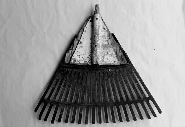 Item #42: Plastic rake head, repaired with plywood, galvanised iron and nails